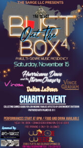 Come on out and join Hurricane Dave and The Storm Chasers along with Virosa, Vince Graham, and Dalton LaFever for the “Bust Out the Box 4” Charity Event @ Wagon Wheel, 2308 E Platte Ave (80909) on Saturday, November 15th. Performances start at 8:00 pm: $15 at the door / $10 with a canned good donation. They are partnering with Palmer High School D11 to collect canned goods for low income families affected by the government shutdown. Please help out our neighbors and enjoy an evening of great local music.