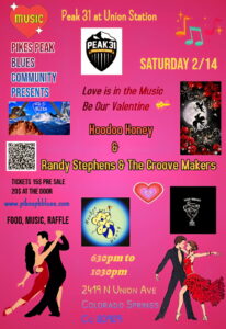PPBC’s Valentine’s Day Special Double Bill – Randy Stephens and The Groove Makers AND Hoodoo Honey @ PEAK 31, 2419 N Union Blvd, Colo Spgs 80909 2/14/2026 6:30 pm – 10:30 pm.